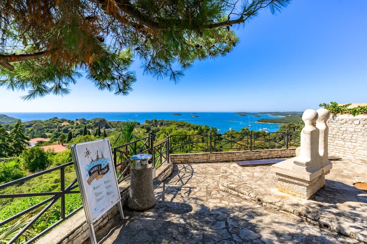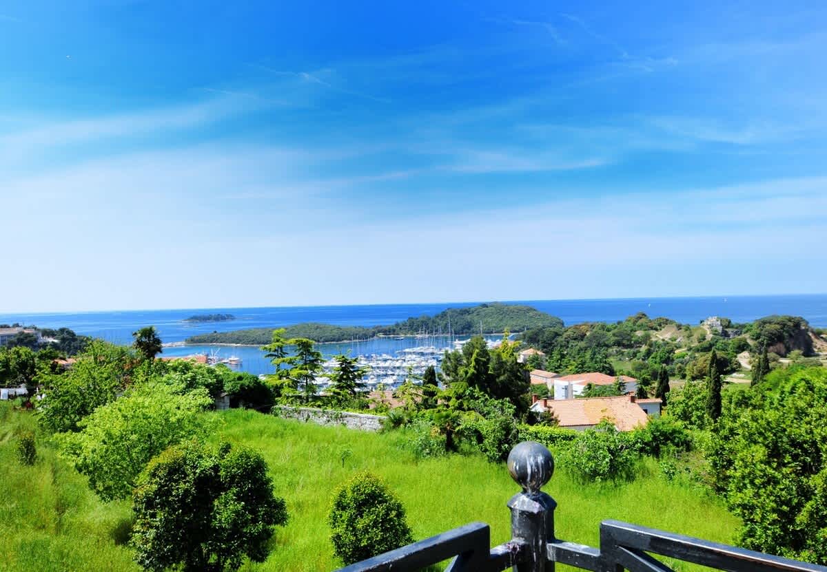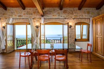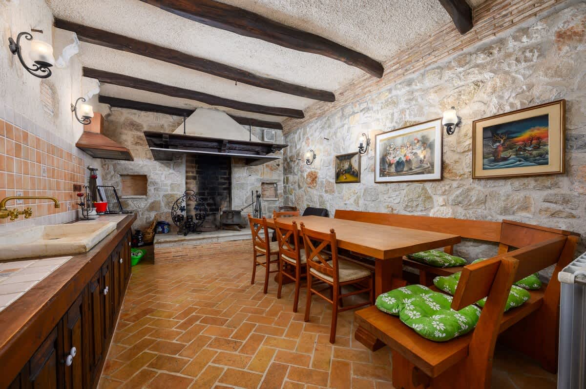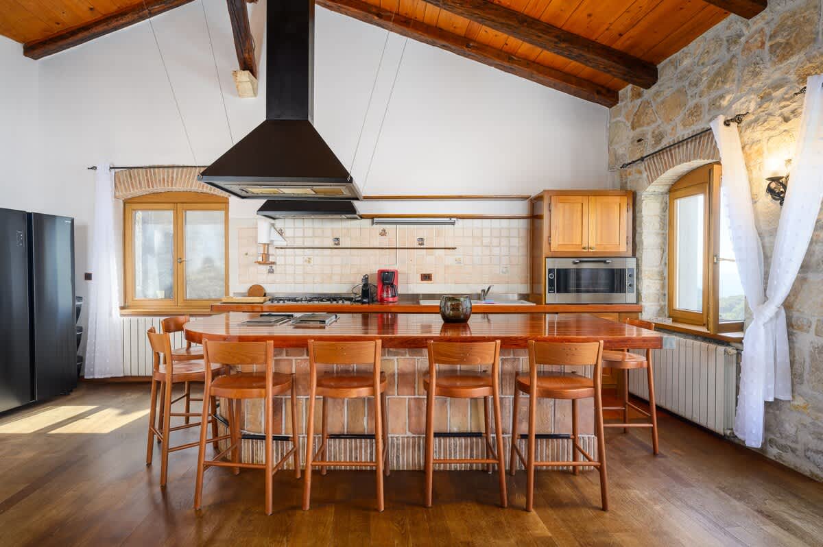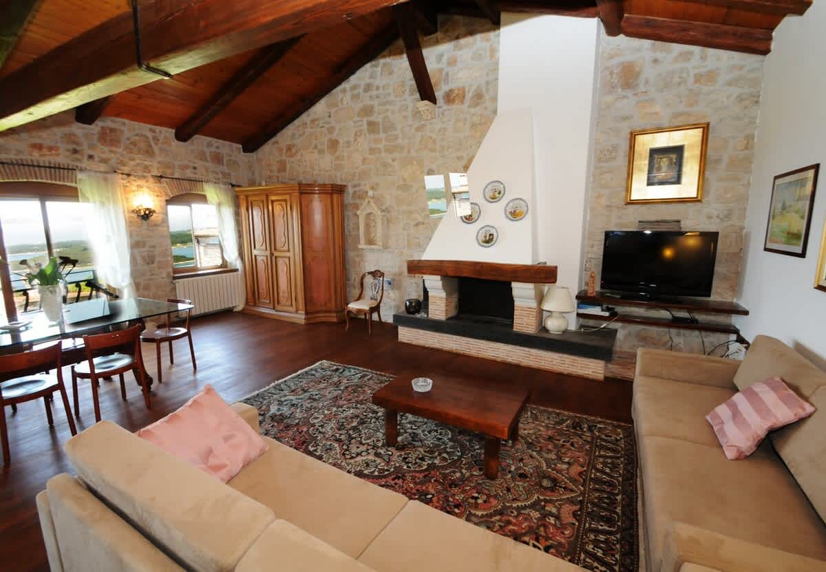 Upstairs, the first floor features a spacious open-plan living area with another fireplace and a fully equipped kitchen. Large windows fill the space with natural light and open up to magnificent sea views across the Vrsar archipelago. The living room is air-conditioned and includes a pull-out sofa, providing additional sleeping space for two guests.
