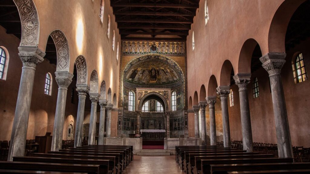 The Basilica Euphrasius Porec is a three-nave basilica with a central apse and two side aisles. The basilica has 18 marble columns, featuring detailed carvings and unique capitals decorated with Christian symbols and Bishop Euphrasius’ monogram.