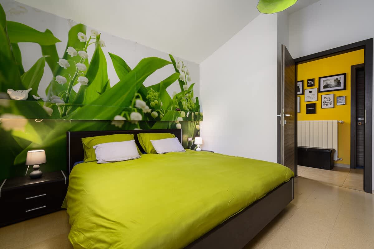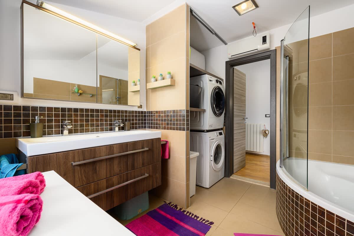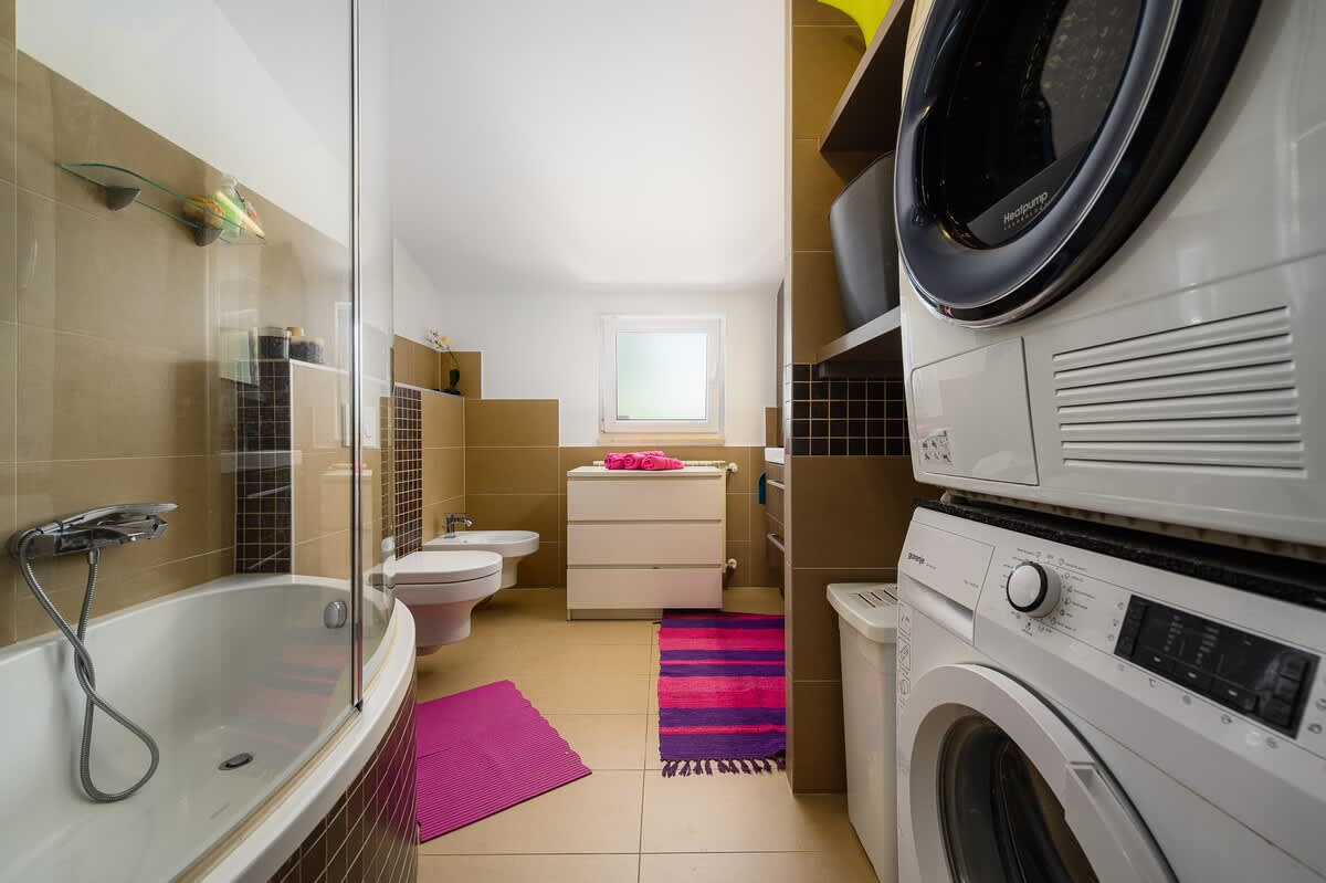 There is bathroom with a bath, washing machine and a drier. There is one bedroom with a large double bed. An extra bed for a bigger child up to the age of 12 or a baby cot can be provided.