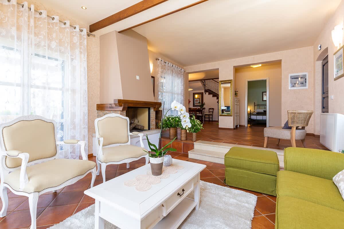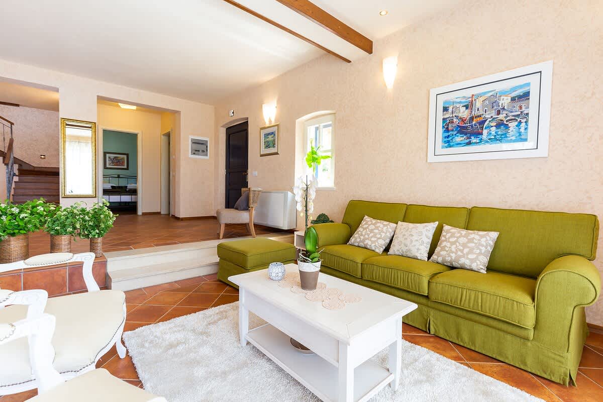 The villa is homely, is very light, and is 220 m². It has views of the garden and the swimming pool.
