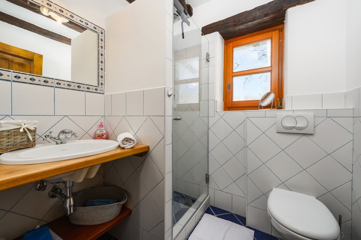 A second bathroom with a shower is conveniently located near the other bedroom.